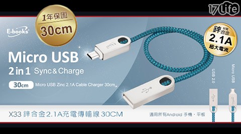 平均每入最低只要199元起(含運)即可享有【E-books】Micro USB鋅合金2.1A充電傳輸線(30cm)1入/2入/4入,購買享1年保固!